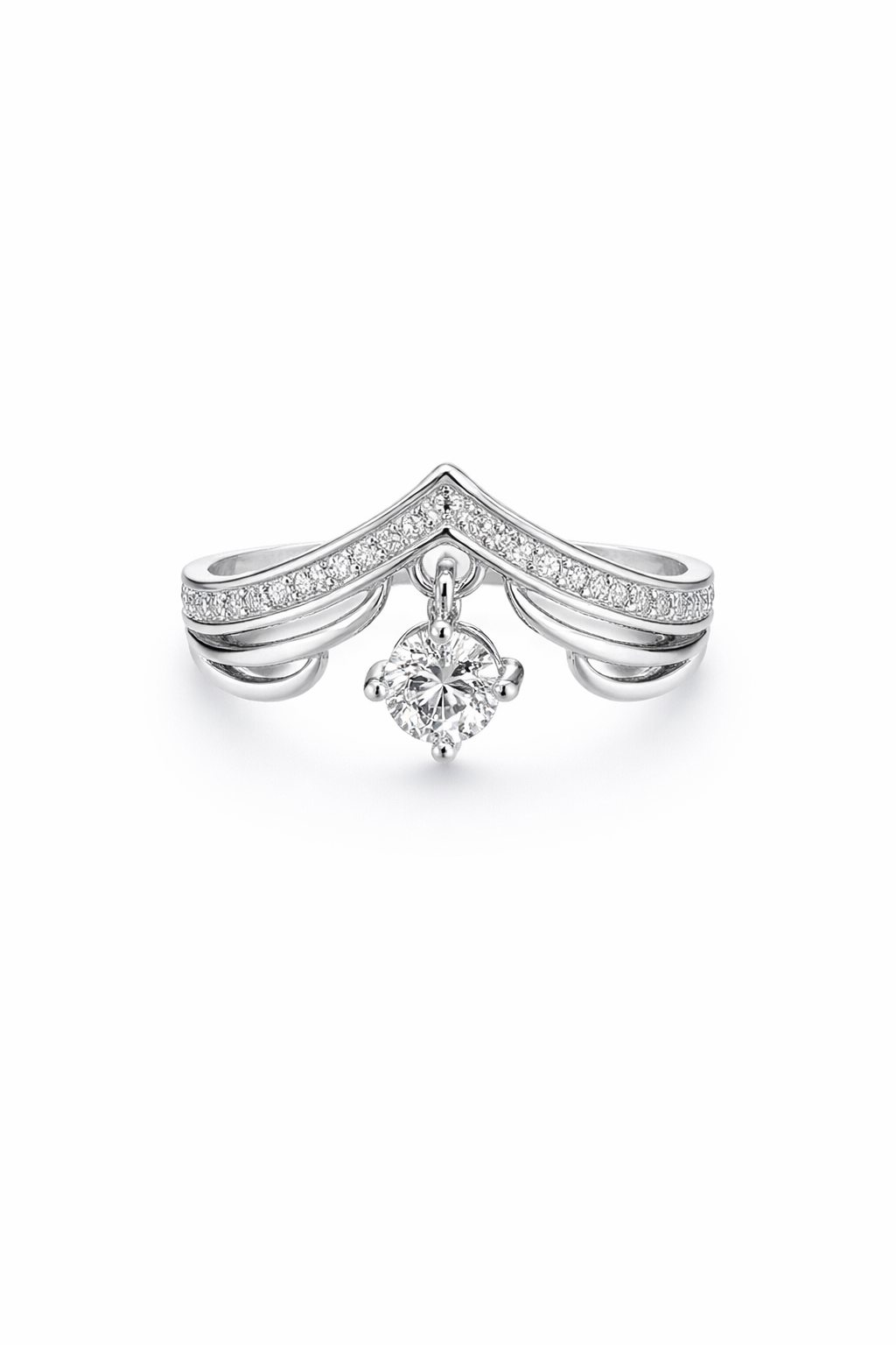 Add a playful touch of luxury to your look with this 3.6-gram Italian Silver ring. The trendy V-shaped (chevron) band is paved with shimmering zircons and features a delicate dangling solitaire stone that catches the light with every movement. A chic and modern choice for those who love unique jewelry.