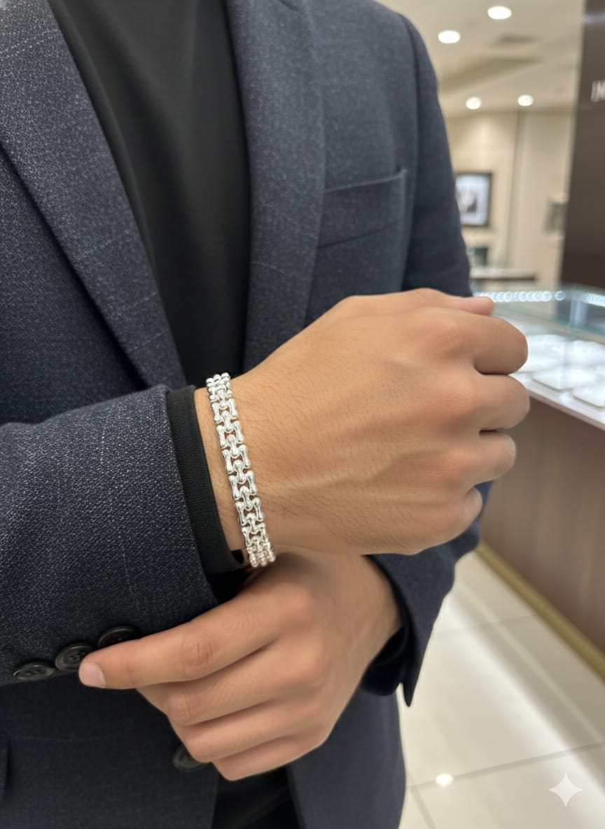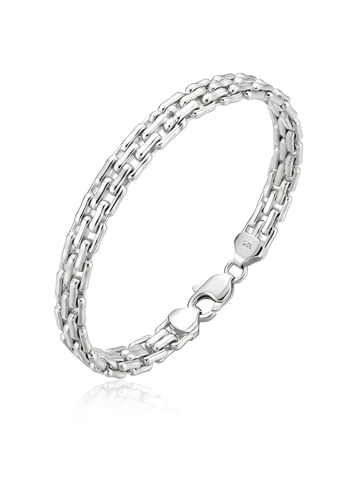 This sophisticated bracelet features a unique woven design, resembling a flexible brick wall of silver. Crafted from 925 Italian silver, the intricate multi-row links are polished to a high shine, creating a fluid, mesh-like texture that wraps comfortably around the wrist. With a noticeable width of 0.7cm, it stands out as a modern statement piece. Weighing 8.13 grams and measuring 19.5cm in length, it is lightweight enough for daily wear yet detailed enough for special occasions. The piece is finished with a sturdy lobster clasp for added security.