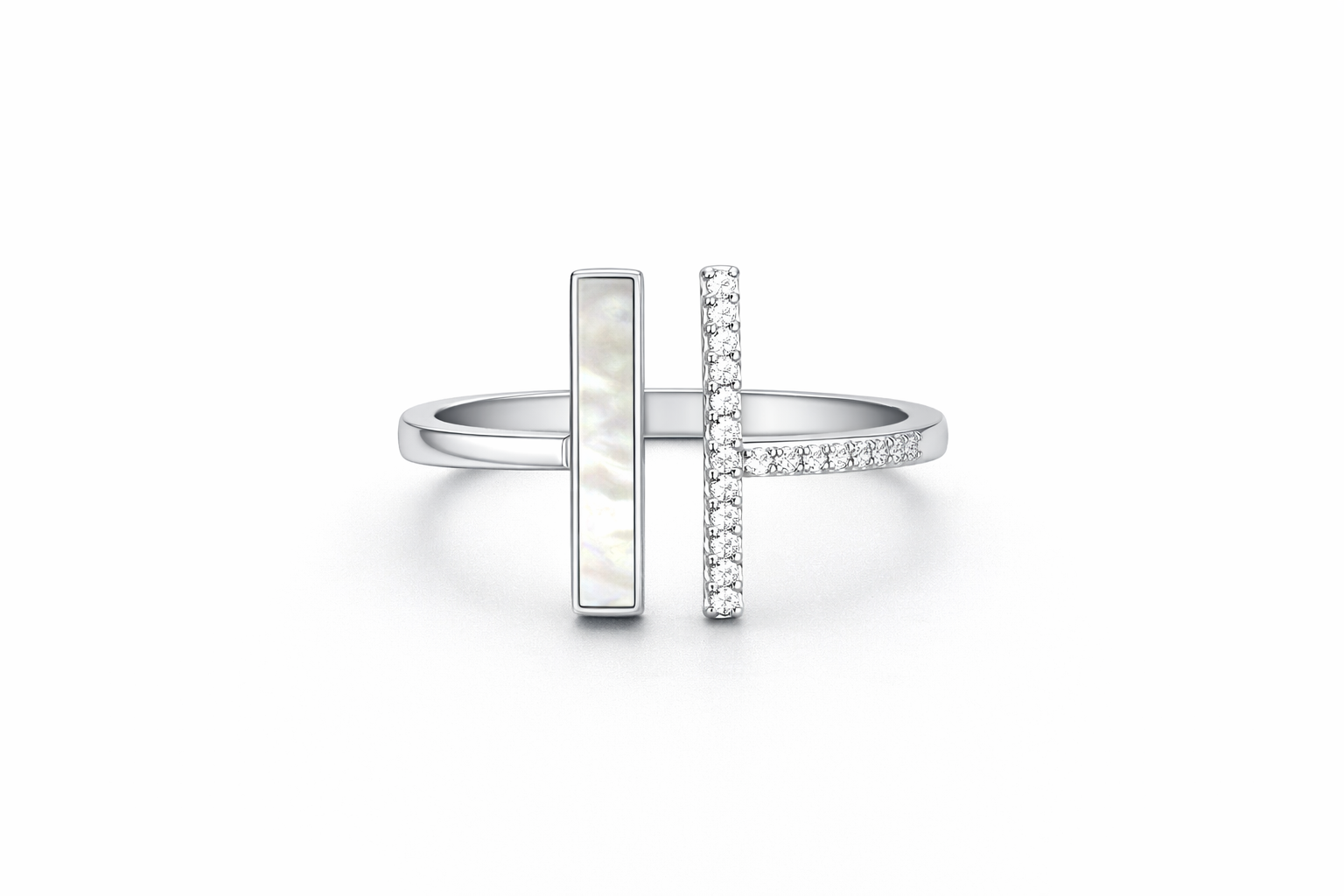 Achieve a chic, modern look with this delicate 1.9-gram Italian Silver ring. The contemporary open design features two parallel bars: one inlaid with lustrous white Mother of Pearl and the other paved with sparkling zircons. Minimalist yet eye-catching, this size 6 ring is perfect for everyday elegance.