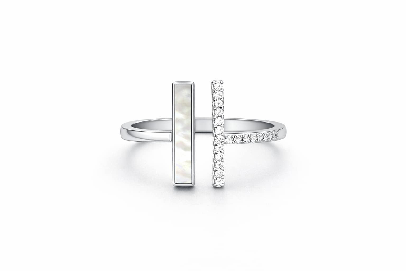 925 Sterling Silver Women's Modern Minimalist Open Ring with Mother of Pearl Inlay and Zircon Accents925 Italian Silver Geometric Open Ring with Mother of Pearl & Zircons – Size 6