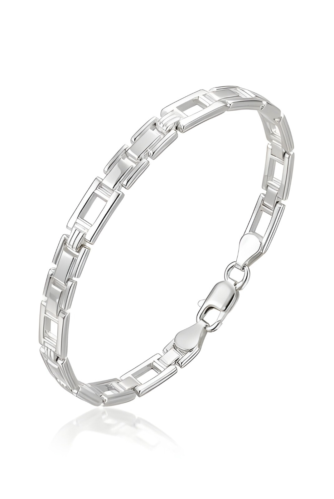 Add a touch of contemporary flair to your collection with this geometric silver bracelet. Crafted from 925 Italian silver, it features a series of polished, open rectangular bar links that create a stylish “ladder” effect. This airy, architectural design offers a modern look that is distinct from traditional chains. Measuring 19.5cm in length and 0.5cm in width, it has a refined presence on the wrist. Weighing 6.54 grams, it is lightweight enough for everyday wear and is finished with a reliable lobster claw clasp for security.