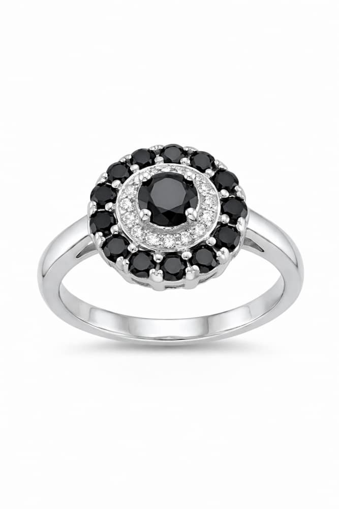 925 Italian Silver Halo Ring with Black & White Zircon Stones