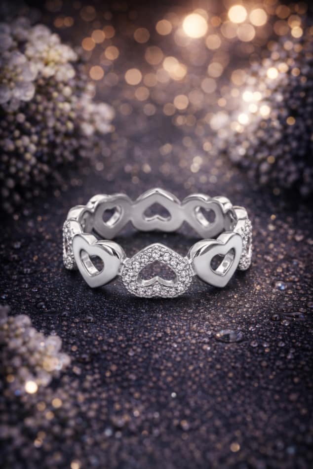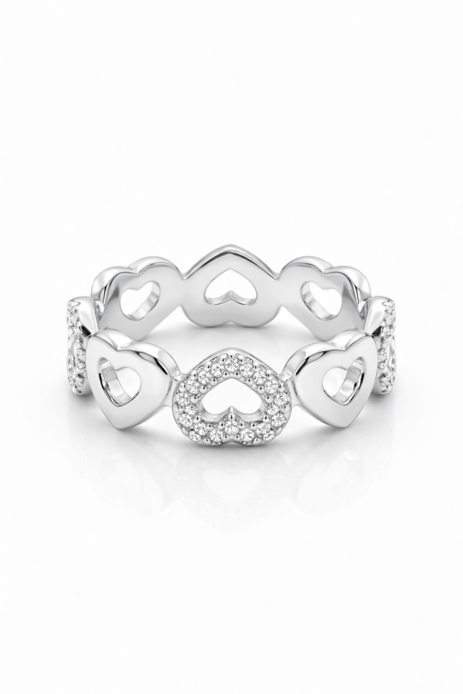 Express your love with this charming 3-gram heart eternity ring, crafted in authentic 925 Italian Silver. The romantic design features an alternating pattern of polished silver hearts and sparkling pave-set zircon hearts, creating a continuous loop of elegance. A perfect gift for anniversaries or as a stylish daily accessory.