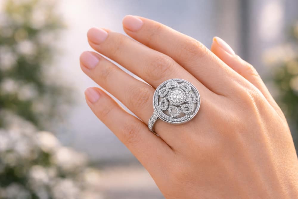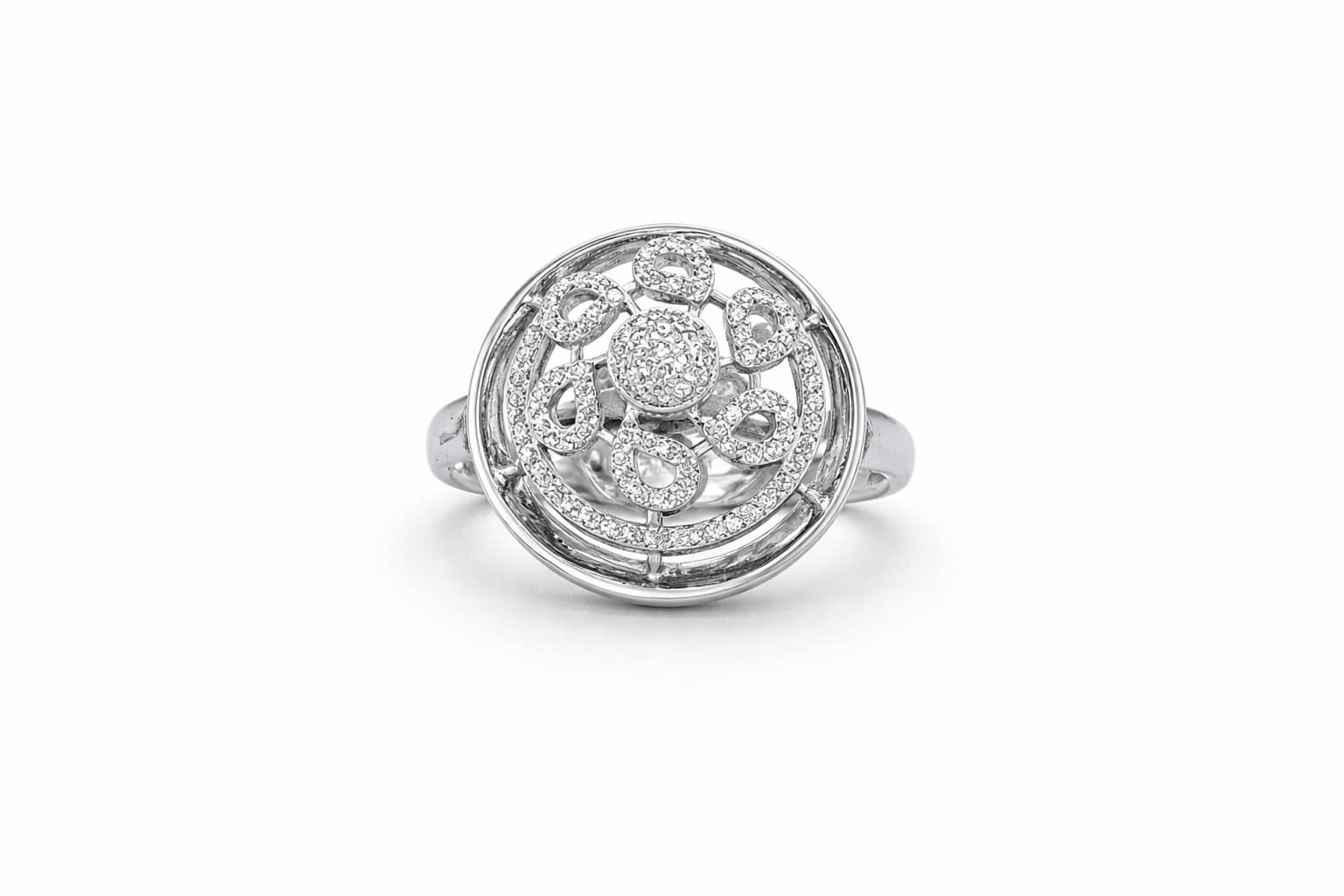 Make a sophisticated impression with this stunning 4.6-gram Italian Silver ring. The design features a large circular face with intricate filigree detailing, forming a beautiful floral mandala pattern. With its polished finish and artistic craftsmanship, this size 9 ring is a perfect statement piece for special occasions.
