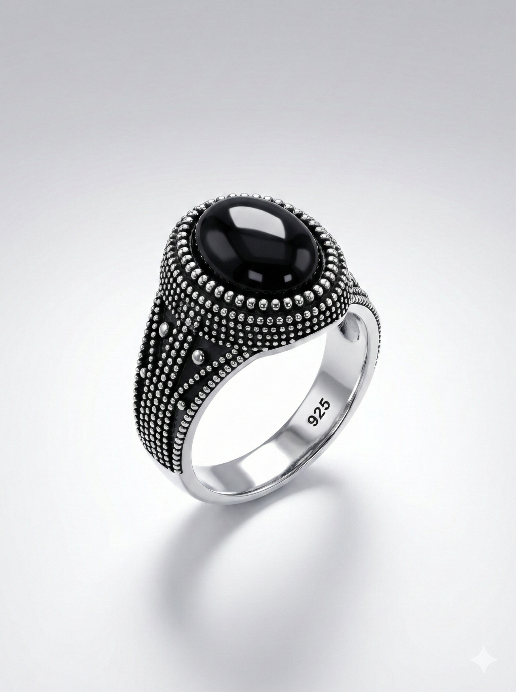 Showcase your unique taste with this impressive 7.5-gram Italian Silver ring. The centerpiece is a bold oval Black Onyx style stone, set in a frame masterfully crafted with detailed dotted textures and oxidation. The intricate granulation work extends along the shank, giving the ring a luxurious, antique feel perfect for statement wear.