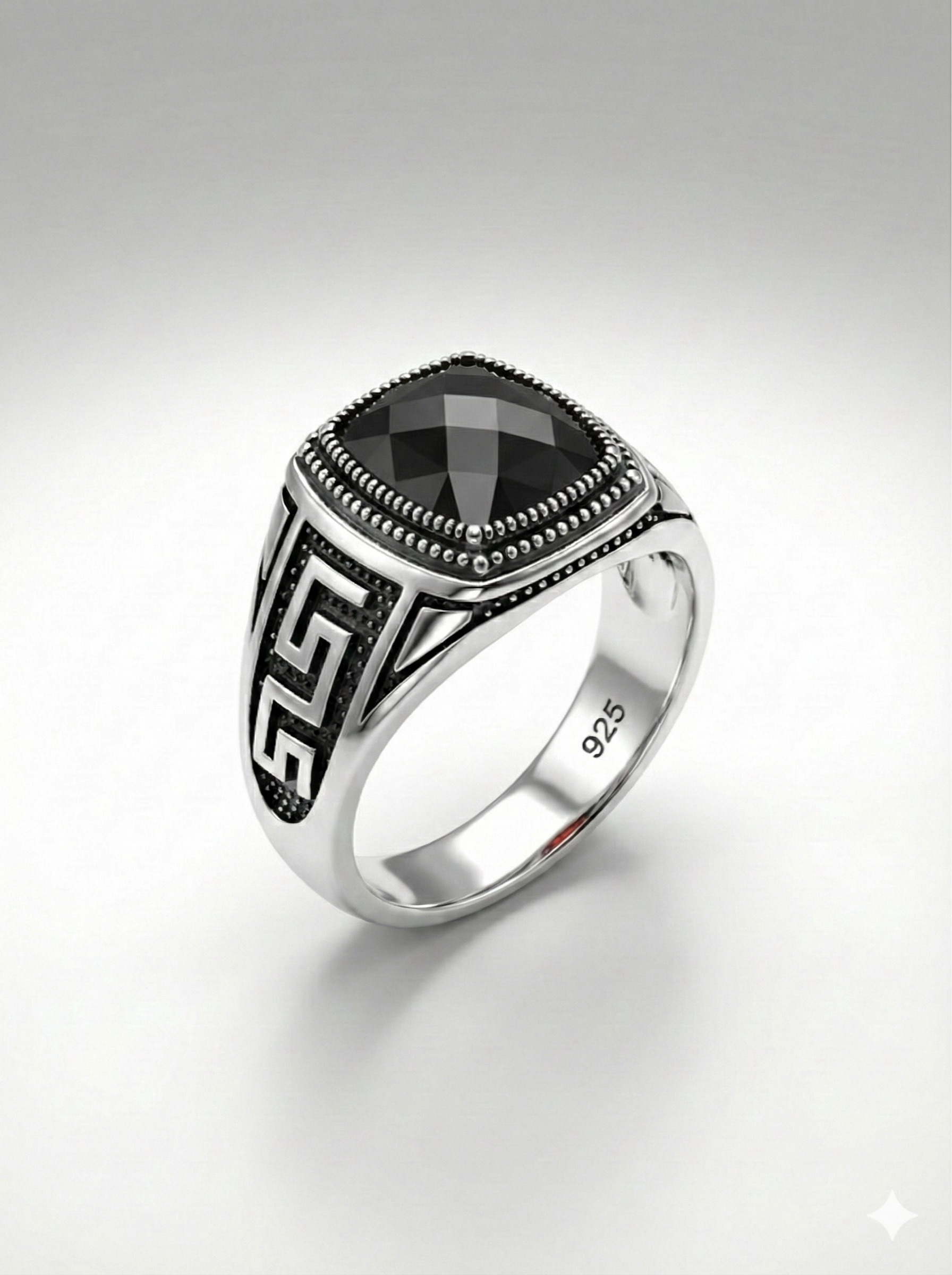 Be the first to review “925 Italian Silver Men’s Ring with Faceted Square Black Stone & Greek Key Design”