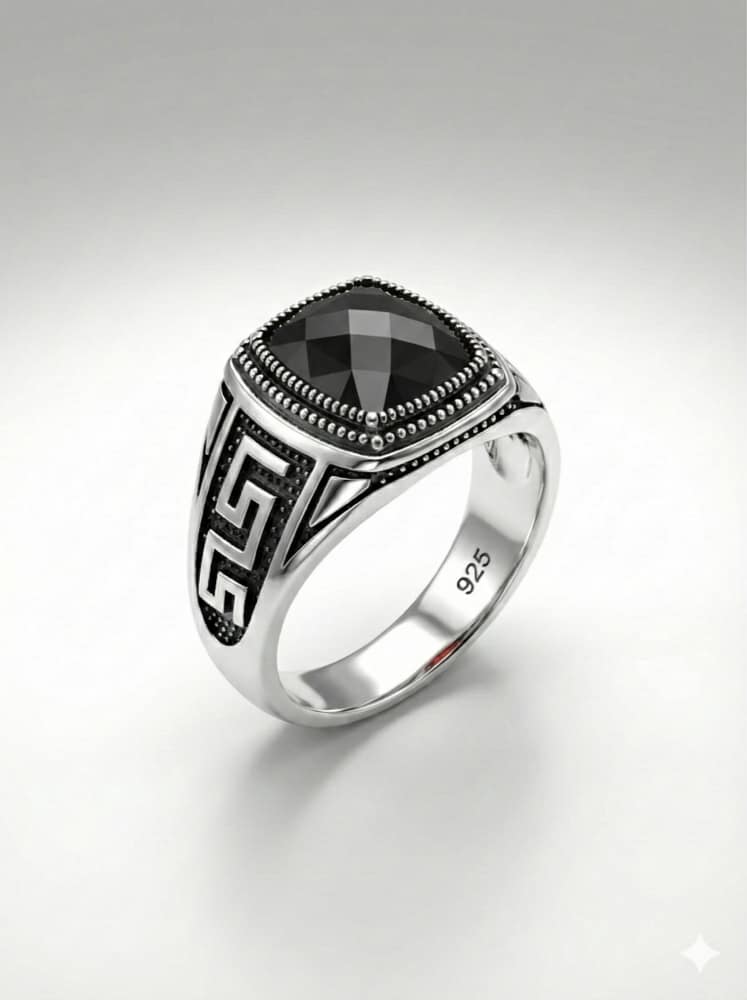 Exude confidence with this 7.2-gram Italian Silver men’s ring. It highlights a sleek, faceted square black stone (Black Zircon/Spinel style) that catches the light beautifully, framed by a beaded bezel. The band features the classic Greek Key (Meander) pattern with an oxidized finish, offering a sharp, masculine look.