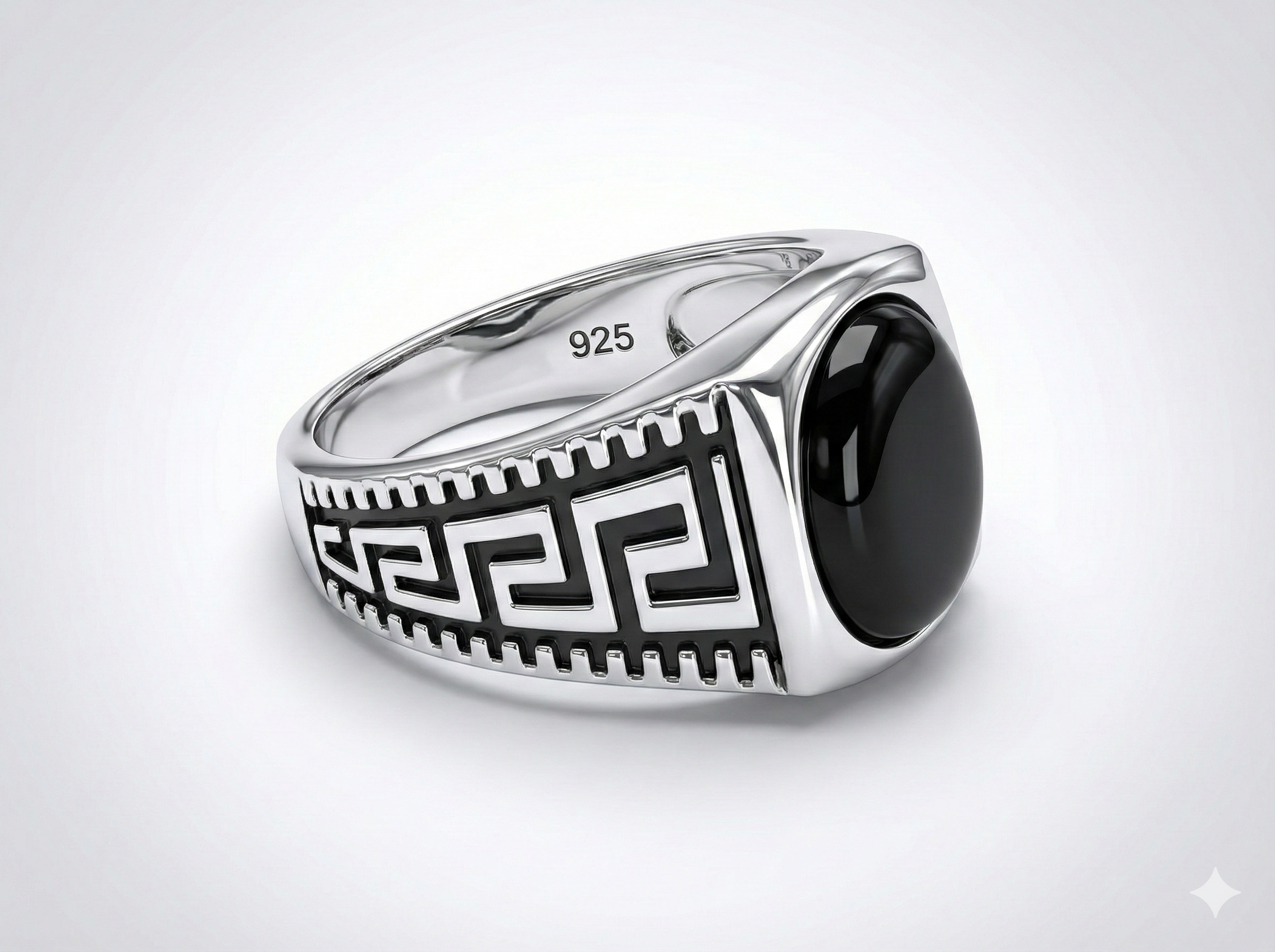 Achieve a timeless look with this 5.4-gram Italian Silver men’s ring. It features a smooth, oval black stone (Onyx style) set horizontally for a modern profile. The band is decorated with a sharp Greek Key (Meander) motif against a black oxidized background, adding a touch of ancient sophistication to a contemporary design.