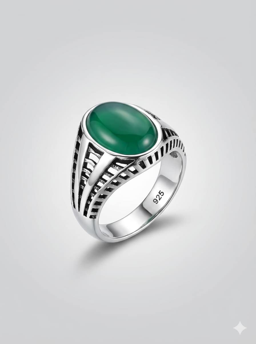 Add a touch of contemporary flair to your look with this 5.8-gram Italian Silver ring. It features a smooth oval Green Agate style stone, set on a band defined by a unique ladder or grill-style cutout pattern on the sides. The oxidized recesses enhance the geometric structure, making it a stylish choice for the modern man.
