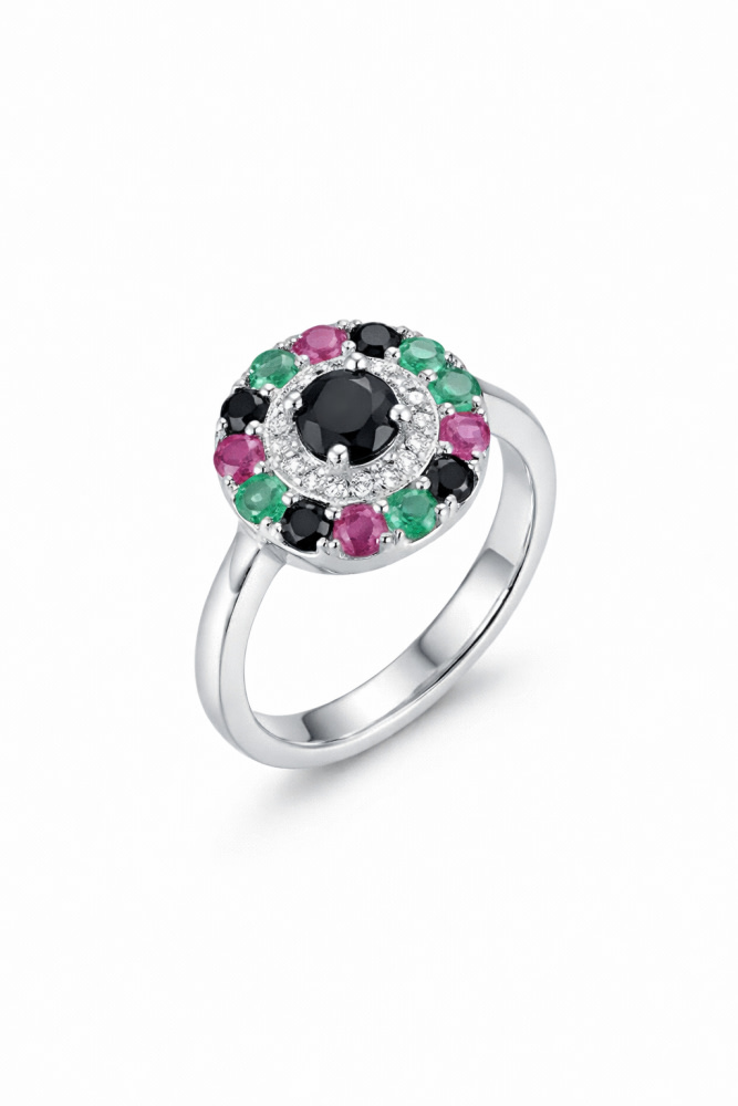 Achieve a classic look with this 4-gram authentic 925 Italian Silver ring. It showcases a bold black center stone surrounded by a shimmering inner halo of white zircons and a striking outer rim of black stones. A perfect blend of elegance and style for any occasion.