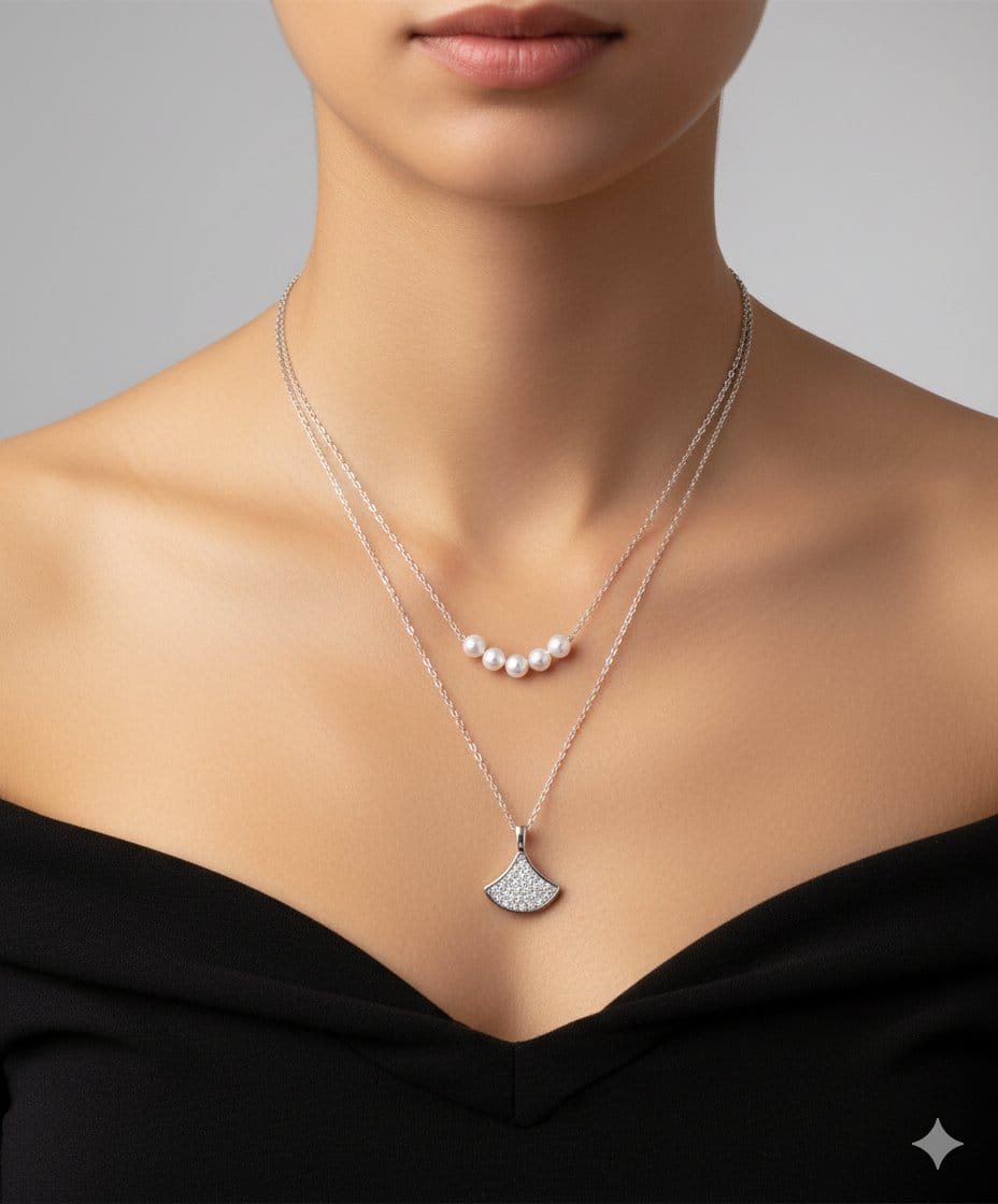 Graceful and elegant, 925 Sterling Silver Double Layer Necklace featuring white pearls and a sparkling fan-shaped pendant. Made from genuine sterling silver (3 grams) with a total length of 25 cm, this piece offers a perfect touch of grace and modern charm. Ideal for both daily wear and special occasions.