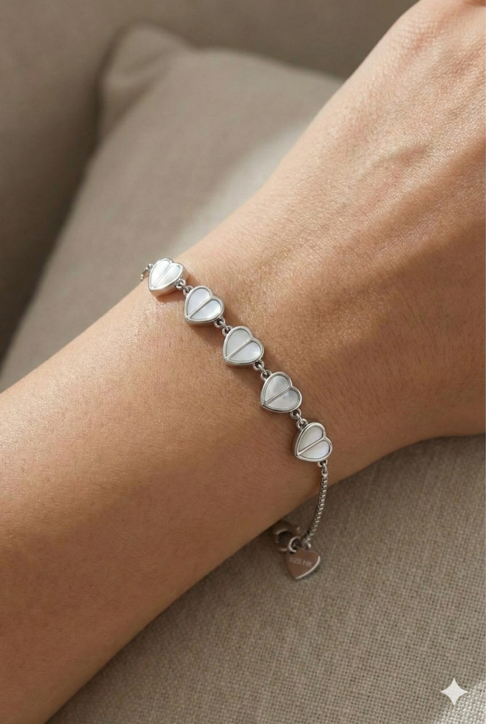 • 🐚 Lustrous Mother of Pearl: Features five beautifully linked heart-shaped charms. Each heart is inlaid with natural White Mother of Pearl, offering a soft, iridescent glow that catches the light.