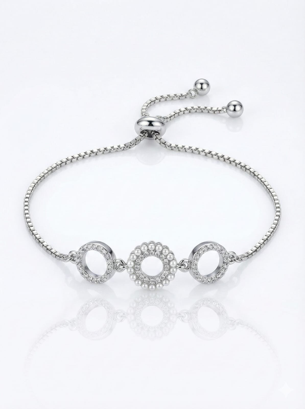 The central circle is adorned with delicate white bead accents that mimic the soft glow of pearls, while the surrounding circles sparkle with precision-set Cubic Zirconia stones. The high-quality silver box chain features a chic bolo slider, allowing you to customize the fit instantly—perfect for those who struggle with traditional clasps.