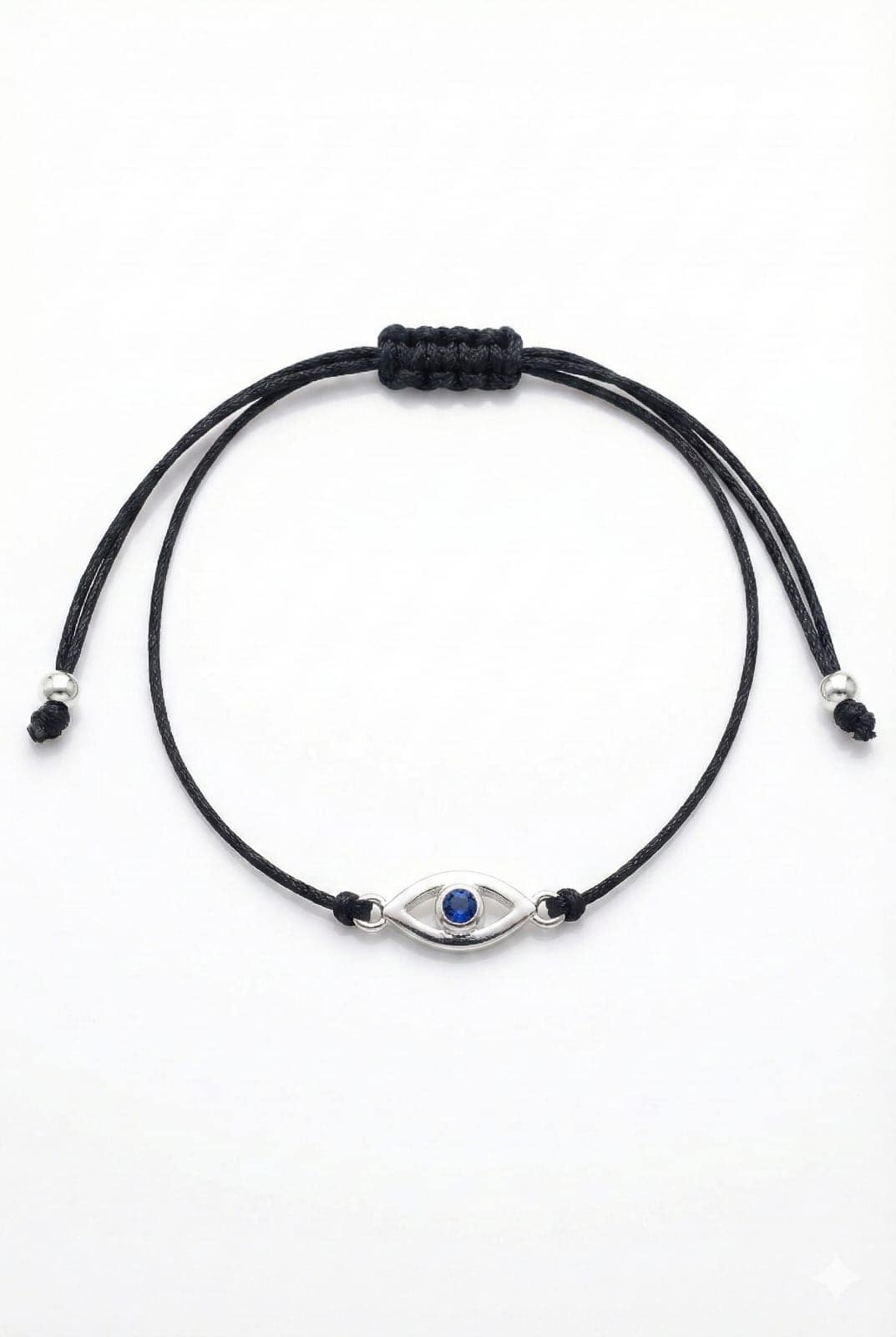 The bracelet’s focal point is a polished silver-tone evil eye charm, accentuated by a striking blue center stone that creates the classic protective symbol. It is crafted with a durable, woven black cord that adds to its minimalist appeal.