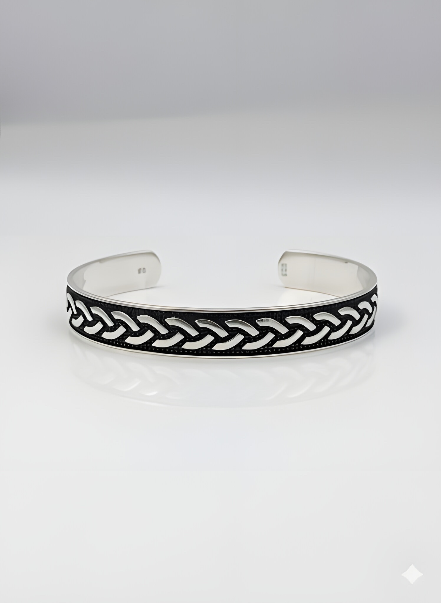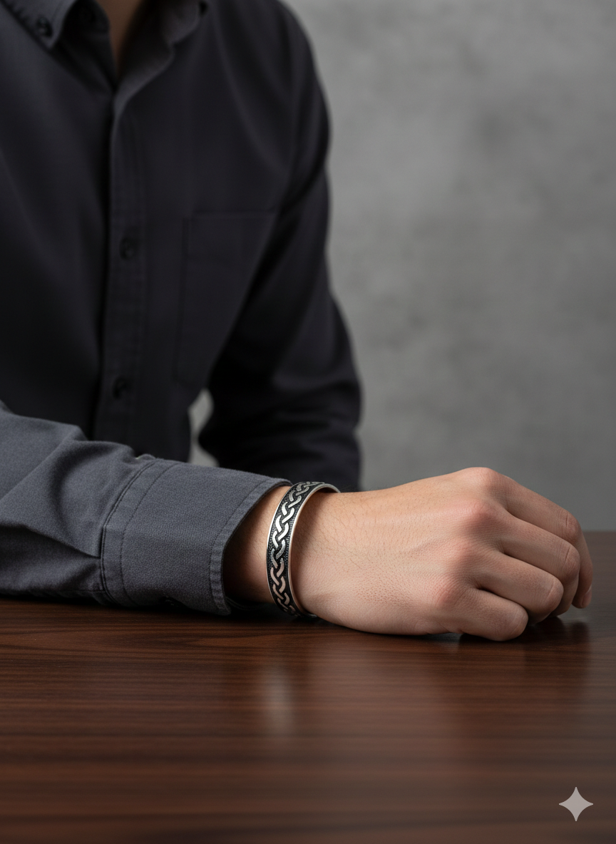 Add a touch of timeless strength to your style with this rugged 28.32g Italian Sterling Silver Cuff Bracelet. The design features an intricate interwoven braided pattern (Celtic Knot style) that stands out boldly against a textured black oxidized background. Made from high-quality 925 silver, this open-cuff bangle is fully adjustable, offering both durability and a perfect custom fit for any wrist size.