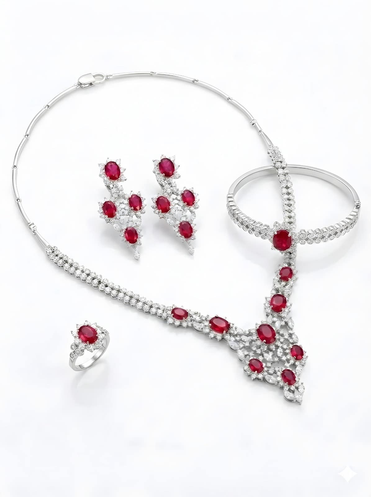 Make a bold statement with this exquisite 74g Italian Sterling Silver Jewellery Set. Finished with high-quality Rhodium plating for a long-lasting, platinum-like shine, this set features captivating Ruby Red stones surrounded by sparkling clear crystals. The collection includes a Y-drop necklace, matching dangle earrings, a stylish hinged bangle, and a ring (Size 7). Ideal for weddings and evening wear, this set offers the look of luxury white gold jewellery.