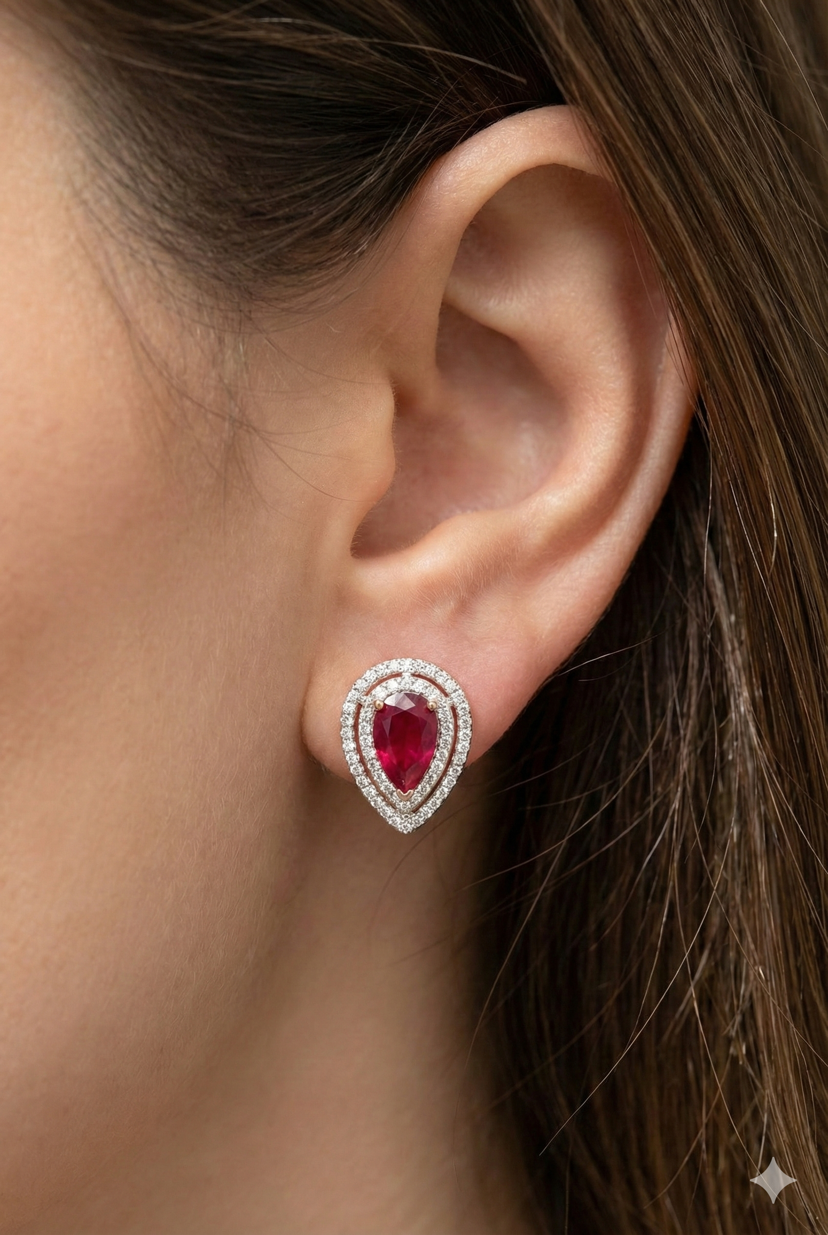 Crafted from silver and finished with high-quality gold polishing, these earrings offer a luxurious look. The centerpiece of each is a stunning pear-cut ruby, known for its deep red color. This central stone is framed by two concentric halos of brilliant American diamonds, maximizing sparkle and brilliance. The earrings feature a secure omega clip with a post, ensuring comfort and safety.