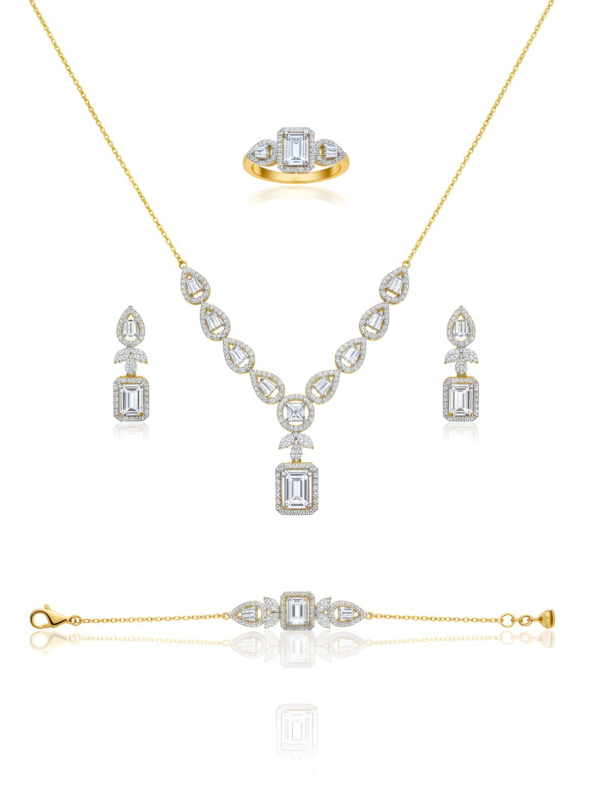 Elevate your style with this stunning 4-piece jewelry set. Crafted from genuine Italian 925 sterling silver with a rich gold polish, it features dazzling emerald-cut center stones surrounded by sparkling halos. The set includes a 45cm necklace, matching drop earrings, an elegant bracelet, and a size 7 ring. Total weight: 16.5g. Perfect for weddings and special occasions.
