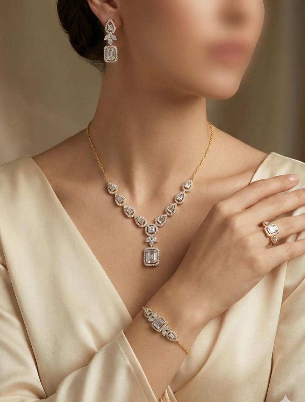 Make a statement of timeless elegance with this exquisite complete jewelry set. Designed for the modern woman who loves classic glamour, this set is meant for weddings, parties, and grand entrances.