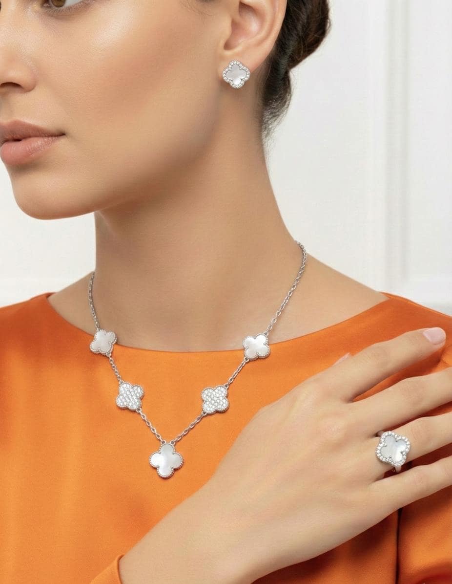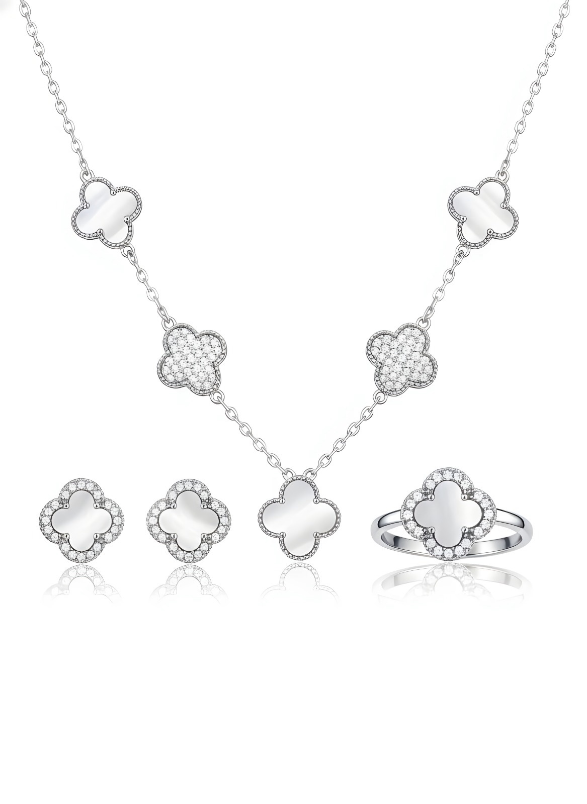 Crafted from high-quality Italian 925 Sterling Silver, this set is designed to last. The central theme is the four-leaf clover, a symbol of good fortune. The necklace features five clovers linked by a delicate chain, alternating between a smooth mother-of-pearl inlay and a full pavé of sparkling cubic zirconia stones for a dynamic look. The matching stud earrings and size 6 ring each feature a single mother-of-pearl clover framed by a halo of smaller, glittering stones.
