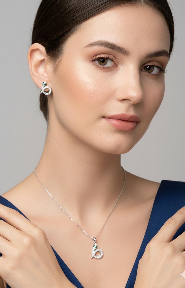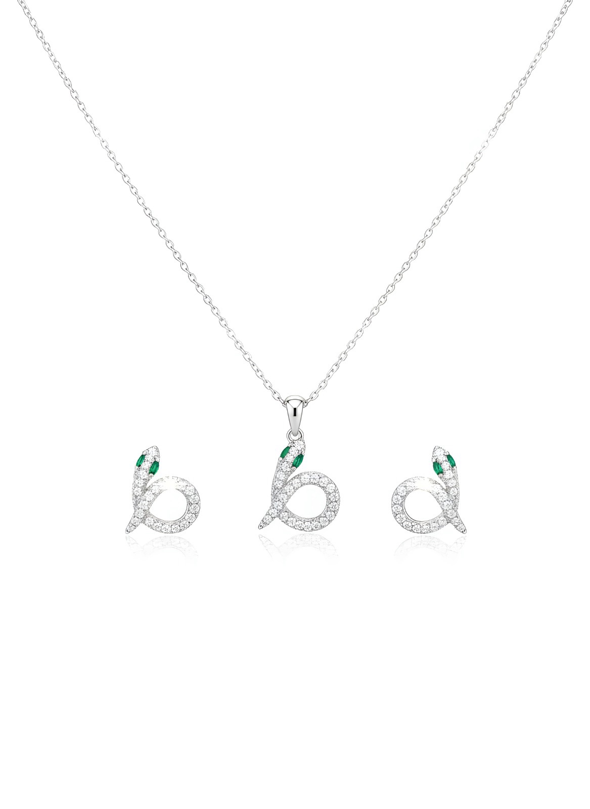 The set includes a delicate necklace and a pair of matching stud earrings. The centerpiece of each item is a beautifully sculpted, coiled snake. The entire body of the snake is pave-set with brilliant, clear stones that catch the light from every angle, while two vivid green stones serve as its eyes, adding a hypnotic touch of color.