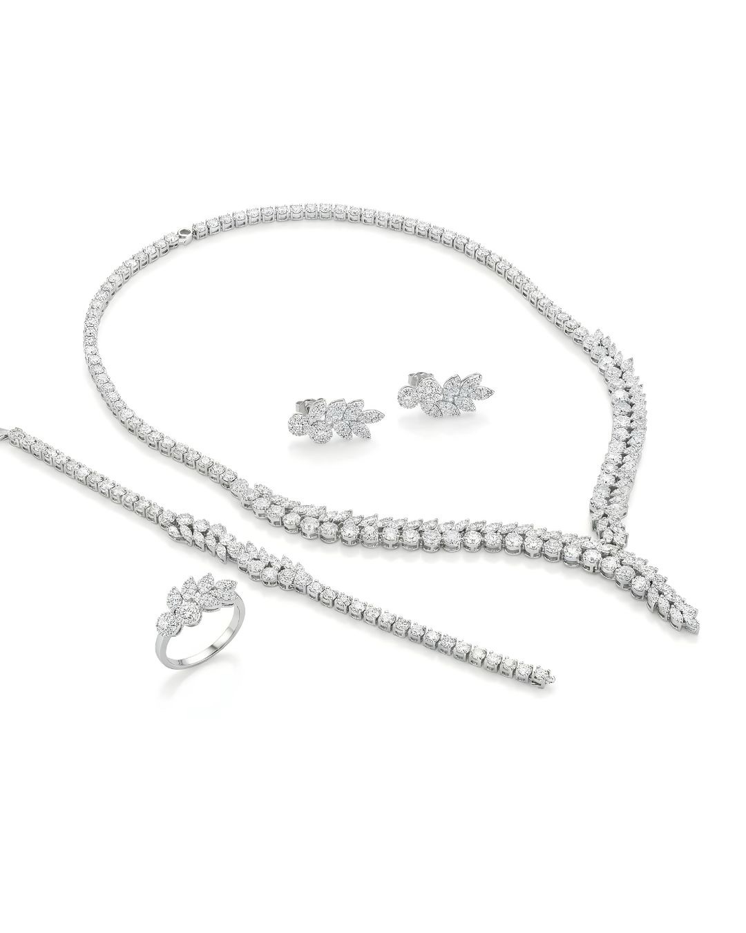 • 💎 Complete 4-Piece Luxury Set: This exquisite set includes everything needed for a coordinated, glamorous look: a statement V-drop necklace, a matching tennis-style bracelet, elegant cluster stud earrings, and a dazzling ring.