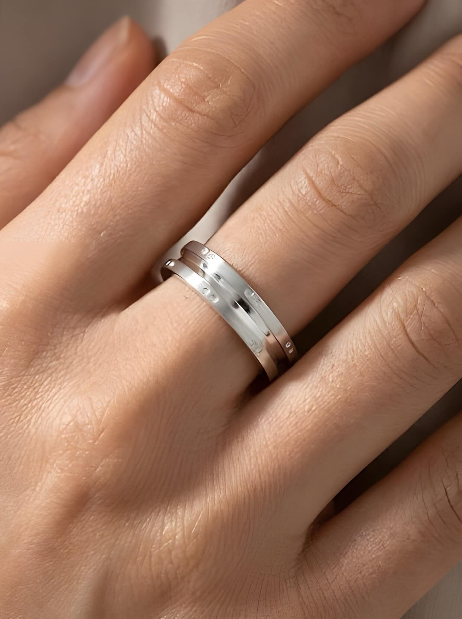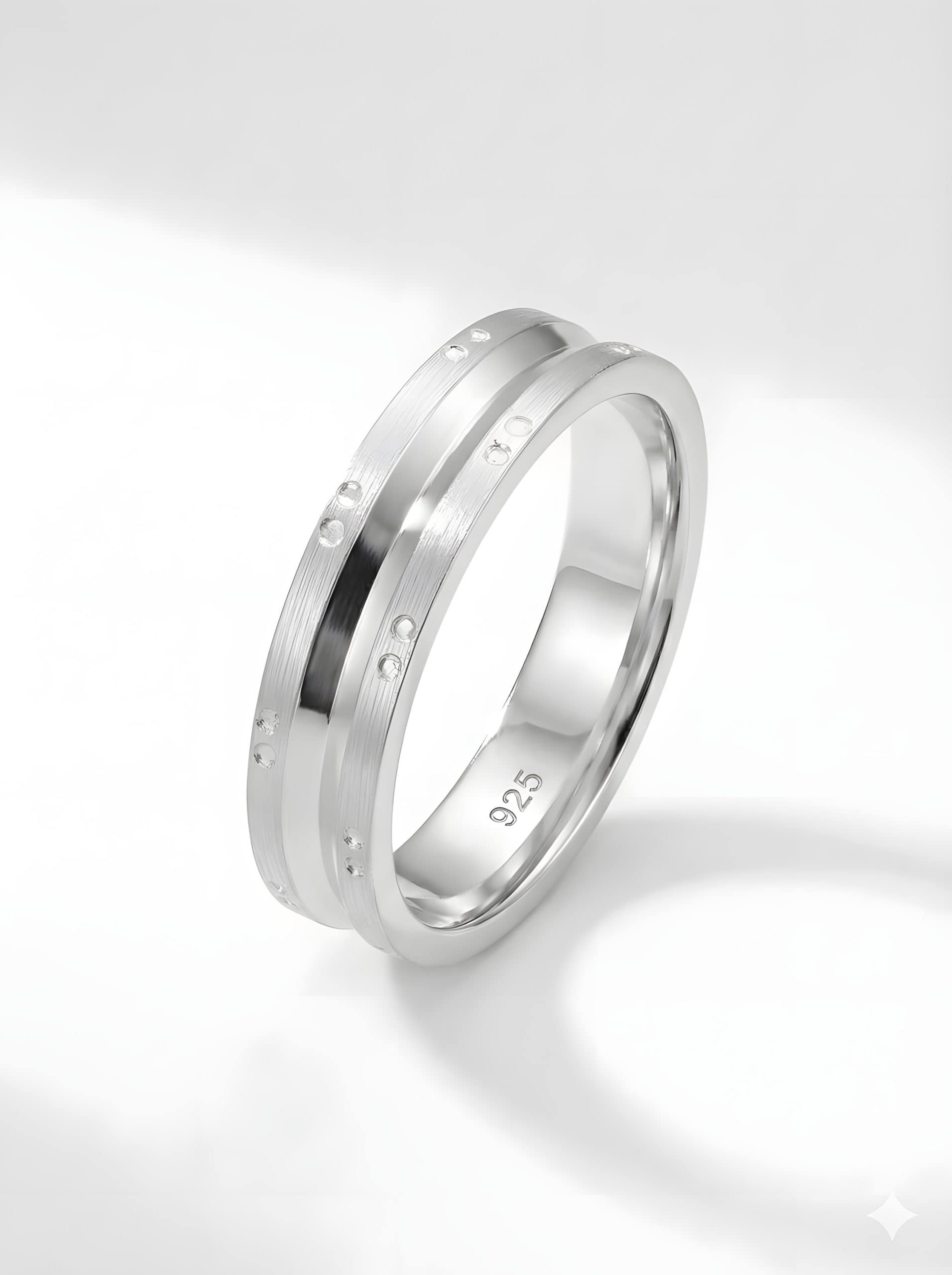 Stand out with this contemporary 925 Italian Sterling Silver Band Ring. The design creates a stunning contrast by combining a soft brushed matte finish with a sleek, polished central groove. Delicate diamond-cut circular accents are scattered across the textured surface, adding a subtle yet captivating sparkle. Finished with durable Rhodium plating and stamped with ‘925’, this ring is perfect for those who appreciate detailed craftsmanship.