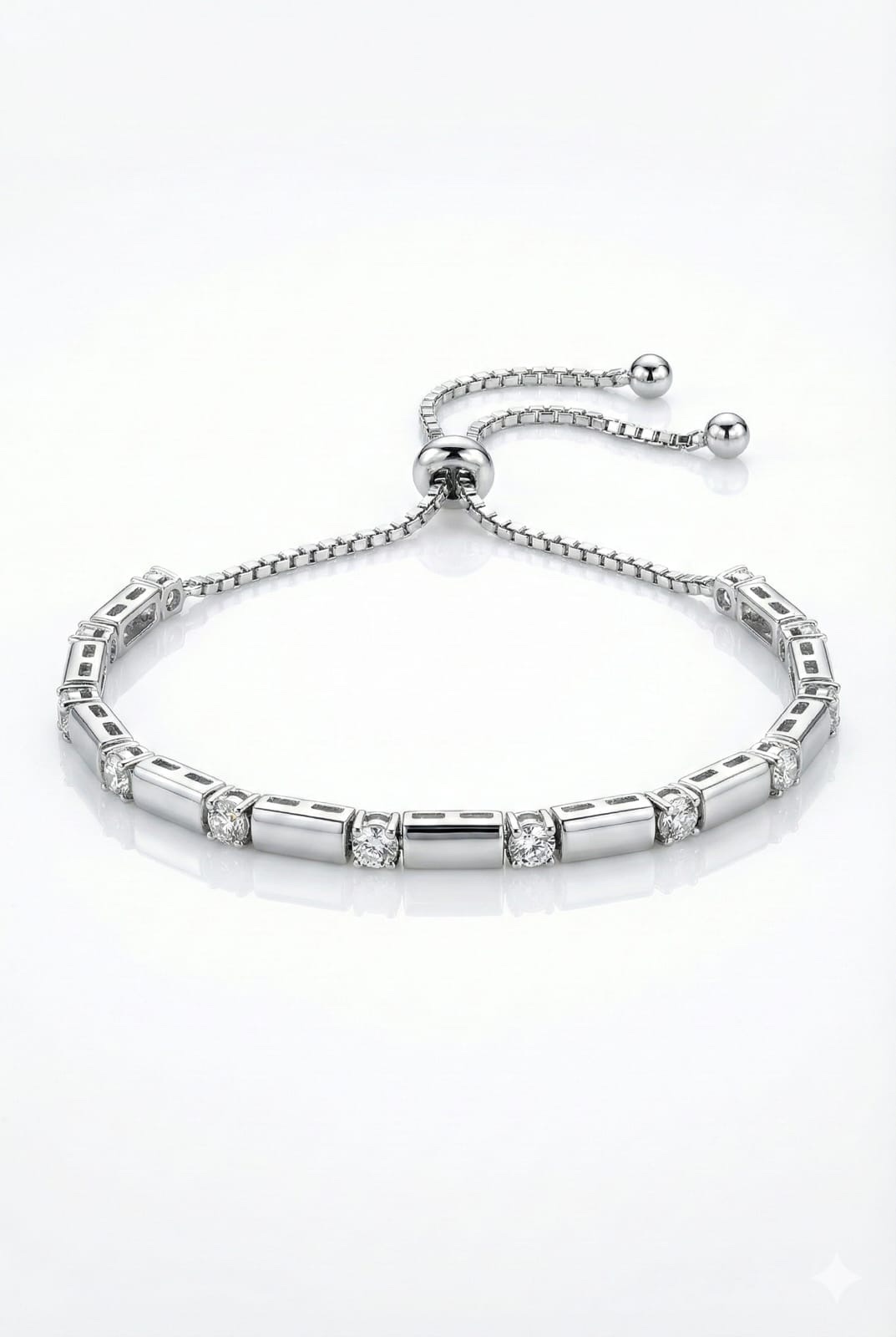 • ✨ Contemporary Alternating Design: Features a sophisticated pattern of sleek, highly polished silver-tone bar links alternating with brilliant, round-cut Cubic Zirconia stones. This creates a beautiful contrast of smooth metal and sparkling light.
