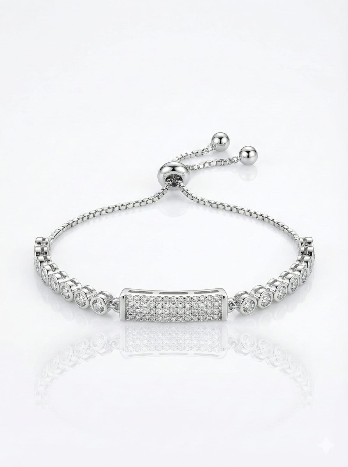 • ✨ Dazzling Pave Design: Features a stunning central rectangular bar charm flanked by a series of circular links. Both the bar and the circles are lavishly pave-set with brilliant clear Cubic Zirconia stones, creating a continuous, sparkling display.