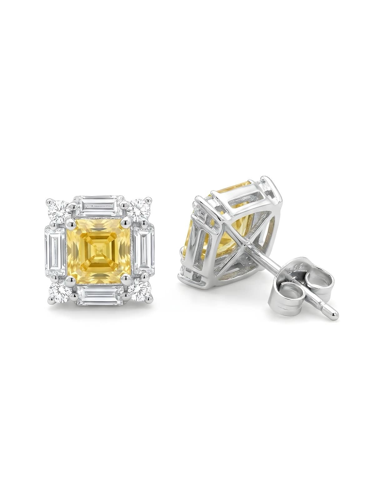 Add a touch of luxury to your look with these exquisite stud earrings. Each earring centers around a prominent, square-cut yellow gemstone that radiates warmth and brilliance. This central stone is framed by an intricate halo design, alternating between sleek baguette-cut and classic round-cut white stones, creating a dazzling play of light. The earrings are set in a polished silver-toned metal and finished with a secure post and butterfly back. The pair has a total weight of 3.20g.