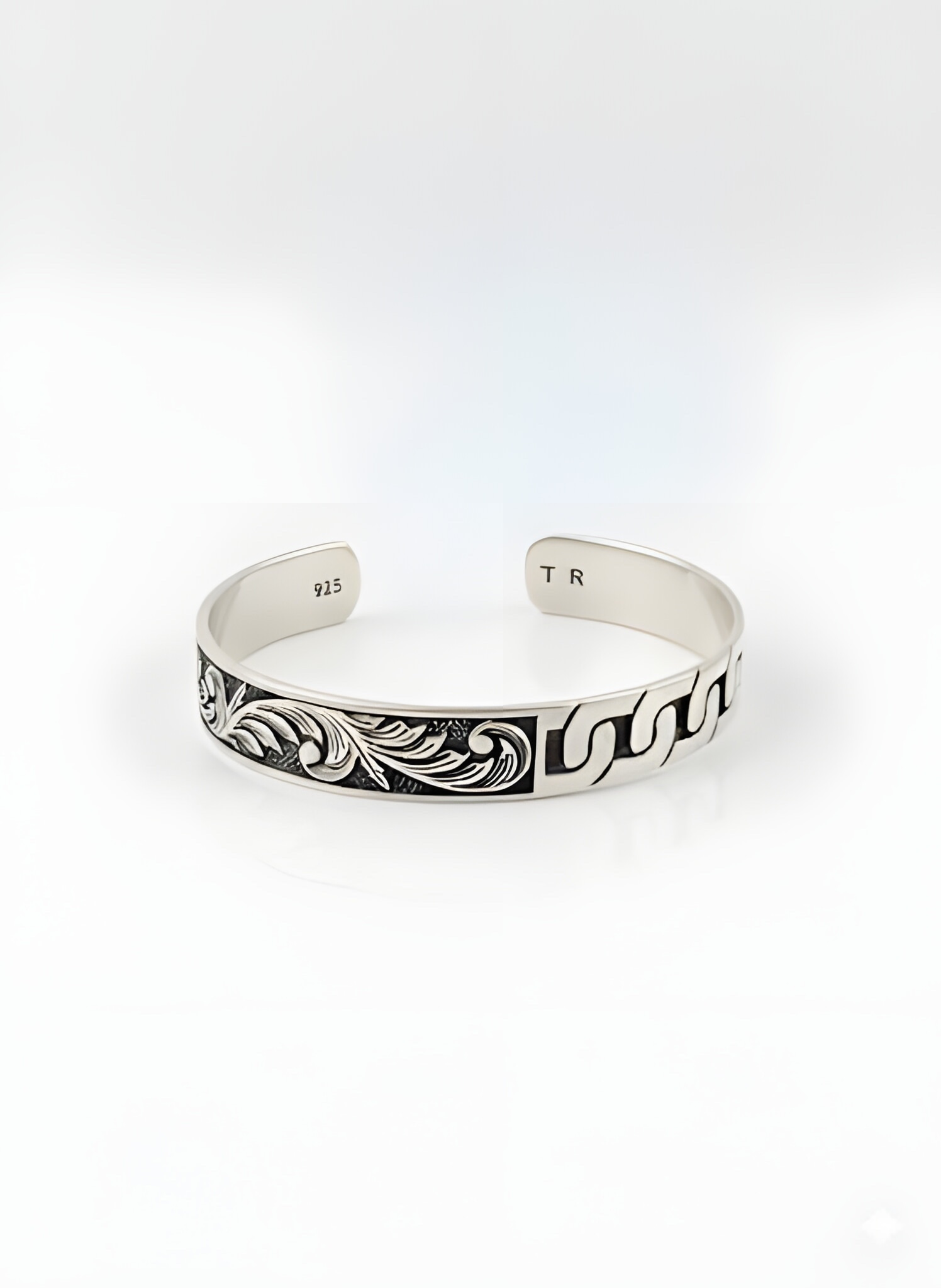 Discover the perfect balance of classic and contemporary with this distinctive 25.90g Italian Sterling Silver Cuff Bracelet. The innovative dual-design features intricate floral leaf scrolls on one side, symbolizing timeless elegance, transitioning smoothly into a bold geometric chain-link pattern on the other. Enhanced with a dark oxidized finish to reveal every detail, this unique bangle offers a versatile look. Crafted from solid 925 silver, the adjustable open-cuff ensures a comfortable fit for any wrist.